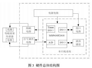 用于固井泥漿的電磁流量計的硬件部分主要由傳感器、電源電路、勵磁電路、信號調理電路、信號采集處理電路及接口電路等模塊組成,如圖3所示。本文重點介紹關鍵模塊勵磁電路和信號調理電路。