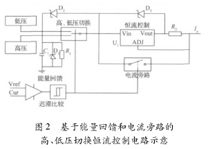 高、低壓切換恒流控制電路是勵磁控制系統(tǒng)中的關(guān)鍵部分,由高、低壓電源、能量回饋電路、高低壓切換電路、恒流控制電路、電流旁路電路和遲滯比較電路組成,其電路原理如圖2所示。