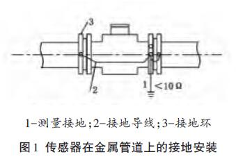 傳感器安裝在塑料管道或內(nèi)壁有絕緣涂層、襯里的管道上,兩端應安裝接地環(huán)(或帶有接地電極的金屬短管),然后用導線連接,使管內(nèi)流動的介質(zhì)與大地短路,具有零電位(見圖2)。