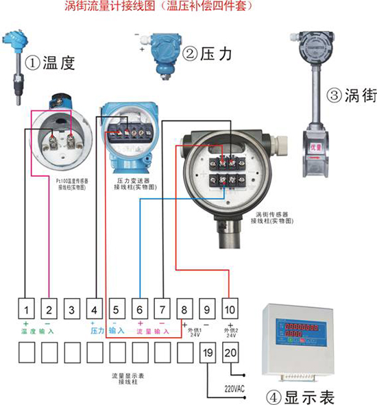 分體式渦街流量計(jì)由流量傳感器、溫度傳感器、壓力傳感器和智能流量顯示積算儀四部分組成,具有智能溫度、壓力補(bǔ)償功能,由智能流量顯示積算儀遠(yuǎn)程顯示介質(zhì)溫度(℃)、工作壓力(MPa)、瞬時(shí)標(biāo)況體積流量(m3/h)和累計(jì)標(biāo)況體積流量(m3)。