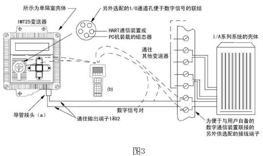 HART通信裝置或裝載在PC機(jī)上的組態(tài)器可以連接在變送器現(xiàn)場(chǎng)接線端到外部負(fù)載之間的任何位置,或連接到另外配供的1/0孔口上。如圖3所示: