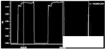 灌裝頭的*終出口部分為10~14mm的可更換縮口。通過縮口,可以產(chǎn)生背壓,一般縮口內(nèi)置蜂窩狀虹吸管,保證灌裝前后的管道滿管。從測試的流量波形上看,10mm的灌裝頭產(chǎn)生適當(dāng)?shù)淖枘嵝Ч?,流量曲線較穩(wěn)定。