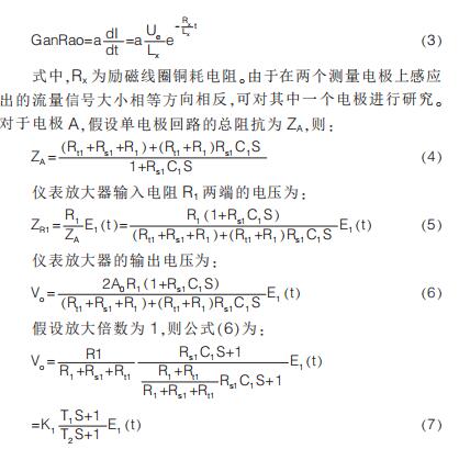 提出在硬件電路上加入模擬開關(guān), 干擾尖峰到來時斷開模擬開關(guān)避免干擾進入后級電路,尖峰過去重新打開模擬開關(guān);K.Saito 等提出漂移校正法,先以高勵磁頻率進行勵磁,在勵磁過程中插入低勵磁頻率提取用于漂移校正的非固定微分噪聲分量,但在插入的低勵磁頻率段漿液噪聲較大且很難將漿液噪聲與流量信號分離,此時的校正因子非單純的非固定噪聲分量,改進措施是長時間取平均值得到穩(wěn)定因子。 傳統(tǒng)方法是同步采樣保持法,即在磁場穩(wěn)定階段采樣。 其他消除干擾的方法有設(shè)置干擾補償機構(gòu)、控制勵磁電流變化率減小干擾幅值、矩形波代替梯形波、希爾伯特黃變換結(jié)合傅里葉變換和程控增益技術(shù)等。經(jīng)上述對現(xiàn)有的文獻分析與總結(jié)可知, 當(dāng)前消除微分噪聲主要從信號處理方面入手,并未對影響噪聲的因素加以研究。 本文建立電極測量回路等效模型,給出仿真模型搭建、參數(shù)取值和仿真結(jié)果分析。