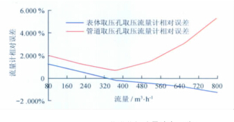 從以上數(shù)據(jù)表和曲線圖中可以看出:天燃氣流量計型號一定的情況下,用表體取壓孔取壓方式檢定流量計時流量計的線性度較好,用管道取壓孔取壓方式檢定流量計時流量計的線性度較差;流量測點相同的情況下,表體取壓孔取壓檢定方式的流量計誤差較小,管道取壓孔取壓檢定方式的流量計誤差較大;兩種取壓方式引起的誤差隨著流量的增大而逐漸增大,在流量為2 900m3/h時兩者相差近6.2%,遠遠超出了流量計的準確度等級。所以,在天燃氣流量計的檢定過程中,應(yīng)避免在流量計表體取壓孔以外的地方取壓進行檢定。