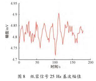 在頻域中對紙漿信號觀察時發(fā)現(xiàn),紙漿信號的漿液噪聲頻帶在零頻率點附近,距離流量信號基波頻率點較遠,對基波幅值和各奇次諧波幅值基本沒有影響,紙漿信號在頻域中的圖形如圖7所示。選擇一組采集的紙漿信號,把其等分成數(shù)段,利用MATLAB計算每段數(shù)據(jù)在基波處的幅值并提取保存在一個數(shù)組中,使用繪圖工具畫出來,如圖8所示。可見,基波幅值在4.7~4.95mV變化,波動較小。因此,提取到的與流量相關的感應電動勢信號幅值會比較穩(wěn)定。