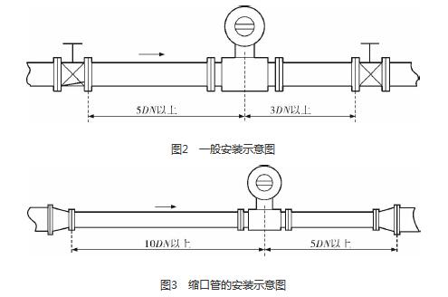 污水處理廠進水流量計的安裝質量對其測量結果的影響較大,因此在安裝時需要注意幾個問題。*先,污水處理廠進水流量計直管段的選擇在配管時一定要按照要求進行選擇,一般選擇流量計通徑與工藝管道通徑相同,即可滿足工程需要,而且安裝方便、壓力損失小,流量計直管段上游側的長度不少于5倍工藝管道直徑,下游側的長度不少于3倍工藝管道直徑(圖2)。但在流速太慢而又要求精度較高或需要變徑的應用場合,可選擇通徑小于工藝管道通徑的流量計,以提高測量精度,此時流量計上、下游必須加裝異徑管,且進口異徑管上游側應有長于10倍工藝管道直徑的直管段,下游側應有長于5倍工藝管道直徑的直管段(圖3)。