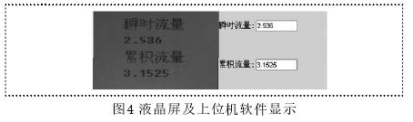 該程序主要用于實(shí)時(shí)更新流量信息,微處理器與上位機(jī)通過RS232接口以modbus協(xié)議進(jìn)行通信。*后,該設(shè)計(jì)液晶屏上所顯示的流量信息與上位機(jī)軟件所顯示的數(shù)據(jù)如圖4所示。