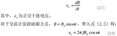 從上圖 2.5 中可以觀察到兩個(gè)電極、勵(lì)磁線圈、轉(zhuǎn)換器內(nèi)阻之間形成了一個(gè)閉合回路,將此回路稱之為初級(jí)繞組,從理論上進(jìn)行分析,磁力線 B 應(yīng)當(dāng)平行于勵(lì)磁線圈所產(chǎn)生的磁感應(yīng)線,但在實(shí)際的應(yīng)用過程中由于工藝差異,因此無法達(dá)到理想狀態(tài),會(huì)產(chǎn)生磁力線穿過勵(lì)磁線圈磁感應(yīng)線的情況,此時(shí)將會(huì)產(chǎn)生相應(yīng)的感應(yīng)電動(dòng)勢(shì),將此部分感應(yīng)電動(dòng)勢(shì)稱為變壓器效應(yīng)。此效應(yīng)同樣滿足于楞次定律,利用楞次定律進(jìn)行計(jì)算可得如下電動(dòng)勢(shì):