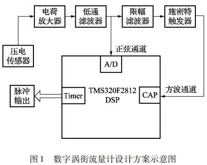 本文設(shè)計(jì)的基于 TMS320F2812 DSP 的數(shù)字煙氣流量計(jì)的信號(hào)處理系統(tǒng)由前置放大電路和數(shù)字信號(hào)處理電路兩部分組成。本文選用的前置放大電路即為目前被廣泛應(yīng)用的普通煙氣流量計(jì)的前置放大電路,主要由電荷放大電路、低通濾波電路、限幅濾波電路和施密特觸發(fā)電路組成; 對(duì)于經(jīng)壓電傳感器測(cè)得的渦街信號(hào)采用了頻域分析和時(shí)域分析相結(jié)合的方式,即由前置放大電路和數(shù)字信號(hào)處理電路相配合。時(shí)域分析通道利用 DSP 事件管理器的捕獲模塊,對(duì)前置放大電路輸出的方波進(jìn)行頻率計(jì)算,然后再由 DSP 事件管理器通用定時(shí)器的比較輸出模塊進(jìn)行脈沖輸出。頻域分析通道即 DSP對(duì)低通濾波電路輸出的疊加了許多噪聲的正弦信號(hào)進(jìn)行 A/D 采樣,再利用 DSP 對(duì) A/D 采樣的結(jié)果進(jìn)行頻譜分析,從而得出此時(shí)渦街信號(hào)的頻率,*后由 DSP 通用定時(shí)器的比較輸出模塊進(jìn)行脈沖輸出。系統(tǒng)設(shè)計(jì)方案示意圖如圖 1 所示。