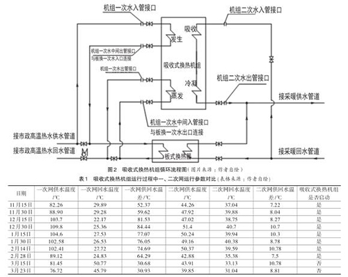 此熱力站高溫渦街流量計的一次網(wǎng)設(shè)計供回水設(shè)計溫度為 :120℃ /36℃,二次網(wǎng)設(shè)計供回水溫度為 :80℃ /60℃。在高溫渦街流量計工作流程中(見圖2),高溫?zé)嵩矗匆淮尉W(wǎng)供水)先進(jìn)入高溫渦街流量計,發(fā)生器作為驅(qū)動熱源,換熱后進(jìn)入板式換熱器,經(jīng)板式換熱器換熱后的低溫水再次回到高溫渦街流量計的蒸發(fā)器,放熱至36℃后返回電廠。熱用戶的二次網(wǎng)回水并聯(lián)后分別進(jìn)入高溫渦街流量計吸收器和板式換熱器,在吸收器和冷凝器及板式換熱器中分別進(jìn)行熱交換,然后一起供給熱用戶。上述過程就是在高溫渦街流量計啟動時,熱力站內(nèi)的實(shí)際供熱流程,在供暖季的初期和末期,可以關(guān)閉高溫渦街流量計,仍然利用板式換熱器單好換熱。