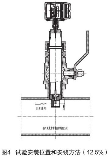 根據(jù)中華人民共和國機(jī)械行業(yè)標(biāo)準(zhǔn):JB/T9249-2015《流量計(jì)》進(jìn)行煙氣流量計(jì)的研制與設(shè)計(jì)。在試驗(yàn)過程中,因?yàn)槔碚撗芯坎怀浞?,再加上?jīng)驗(yàn)不足,采用插入深度是按照以往其它產(chǎn)品(插入式電磁流量計(jì))的經(jīng)驗(yàn),以插入深度為現(xiàn)場管道內(nèi)徑的 12.5% 進(jìn)行試驗(yàn),其對介質(zhì)流量的檢測值與同種規(guī)格管道法蘭式結(jié)構(gòu)的流量計(jì)進(jìn)行比較,偏差值較大、儀表準(zhǔn)確度無法滿足設(shè)計(jì)要求。試驗(yàn)安裝位置和安裝方法如圖 4 所示。