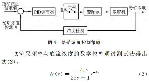 給礦濃度控制策略采用常規(guī)的PID調(diào)節(jié)器實(shí)現(xiàn),如圖4所示。在該控制系統(tǒng)中,給礦濃度設(shè)定值以及反饋的給礦濃度檢測(cè)值為PID調(diào)節(jié)器的輸 入,PID 調(diào)節(jié)器的輸出為變頻泵的頻率。該頻率可進(jìn)行自動(dòng)與手動(dòng)兩種控制模式。以變頻控制方式對(duì)濃密機(jī)的底流泵進(jìn)行精密轉(zhuǎn)速控制,即可控制濃密機(jī)排出的底流礦漿的濃度。