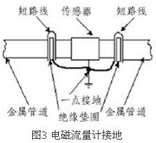 (4)盡量避開振動(dòng)源、磁源(大功率電機(jī)、變壓器)由于流量計(jì)的測(cè)量感應(yīng)電壓很小,電壓較低,易受外界電磁噪聲的影響,故在安裝時(shí)應(yīng)進(jìn)行可靠的接地連(跨)接。金屬管道流量計(jì)接地連(跨)接方法如圖3所示