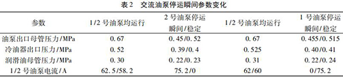通過內(nèi)部旁通將冷油與熱油混合,經(jīng)過銅粉- 煤油 - 蠟感溫元件控制冷熱油混合比例,將油溫調(diào)節(jié)到 49 ℃。一臺管道電磁流量計穩(wěn)定運行,油泵出口母管壓力 0. 5 MPa,潤滑油母管壓力 0. 24 MPa,均屬于正常情況,而兩臺交流油泵并列運行時,停運其中一臺交流油泵瞬間會觸發(fā)電磁流量計出口母管壓力開關(guān)動作,說明停運瞬間油壓發(fā)生波動,且油泵出口母管油壓波動至小于 0. 45 MPa。正常運行時電磁流量計出口油溫 71.5 ℃,冷油器出口溫度45 ℃,混合后潤滑油母管溫度52.5 ℃,由能量守恒定律可知,經(jīng)過冷油器的油量/不經(jīng)冷油器的油量= ( 71.5-52.5) ÷ ( 52.5- 45) = 2. 53,說明有 70% 左右的油量經(jīng)過冷油器。當 2 臺管道電磁流量計運行時油量大于單泵運行,其中一臺電磁流量計瞬間停運時油量減少,尤其是經(jīng)過冷油器的油量大量減少,油量在溫控閥二次分配過程中出現(xiàn)調(diào)節(jié)異常,導(dǎo)致油壓過大波動。為檢驗溫控閥工作情況,保持 1 號、2 號交流油泵運行,選取機組正常帶負荷運行時油溫 52 ℃,分別停運 1、2 號交流油泵,觀察 1、2 號交流油泵停運瞬間油泵出口母管壓力波動情況,試驗各參數(shù)變化見表 2。