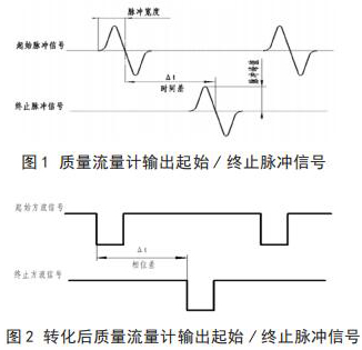 將插入式電磁流量計(jì)流量與相關(guān)測(cè)試設(shè)備連接起來,就可以進(jìn)行插入式電磁流量計(jì)的校準(zhǔn),時(shí)間差△ t 由專用試驗(yàn)測(cè)試設(shè)備可以測(cè)出。起始脈沖信號(hào)和終止脈沖信號(hào)如圖 1 所示。經(jīng)過專用試驗(yàn)測(cè)試設(shè)備信號(hào)轉(zhuǎn)化后的信號(hào)方波如圖 2 所示。