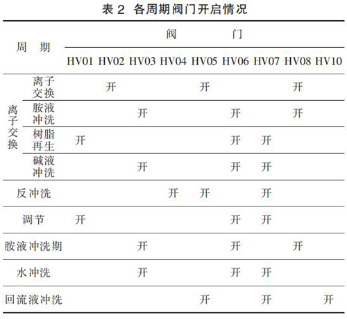 5)回流沖洗周期。 胺液每天都需取樣化驗(yàn),如果發(fā)現(xiàn)胺液中有不溶或懸浮的過(guò)渡金屬聚集,則每天運(yùn)行周期結(jié)束后需利用回流液對(duì)樹(shù)脂進(jìn)行清洗,以防止腐蝕和樹(shù)脂損壞。 如果選擇了此選項(xiàng),PLC程序會(huì)在每天完成目標(biāo)數(shù)量的離子交換周期后,自動(dòng)執(zhí)行回流液清洗周期。 各周期閥門(mén)對(duì)應(yīng)開(kāi)關(guān)情況,如表 2 所示。