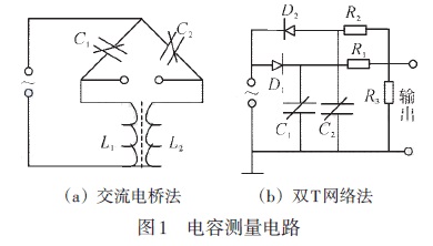 差壓液位變送器的測量電路如圖1所示,變送器的輸出可以轉(zhuǎn)換成電壓、電流或頻率等信號,然后放大。圖1(a)的交流電橋法是將兩個電容器接于交流電橋的兩個相鄰臂上,交流電橋的輸出經(jīng)放大與相敏檢波后進行測量。圖1(b)的雙T網(wǎng)絡(luò)法壓差引起的電容變化轉(zhuǎn)換成電壓變化輸出。在交流電源正半周時,通過二極管D1對電流器C1進行充電,在負半周時,電容器C1經(jīng)電阻R1與R3進行對地放電;而電容器C2 則在電源的負半周充電、正半周對R3 與R2 反向放電。因此R3上兩端的電壓輸出是由C1與C2的平均放電電流之差所決定的。當(dāng)壓差為零時,C1、D1、R1與C2、D2、R2的參數(shù)相同,則通過R3的平均放電電流之差為零。當(dāng)壓差不等于零時,差動電容C1與C2一個增大一個減小,使兩者的平均放電電流不相等,因此R3兩端的電壓輸出也就有了相應(yīng)的變化。