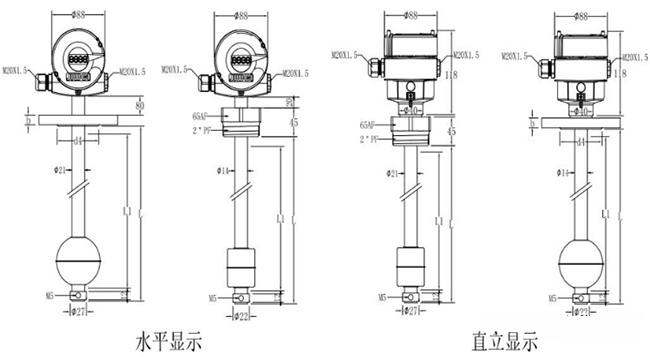 為更直觀地給用戶展現(xiàn)浮球式液位計的規(guī)格,請參考兩種浮球式液位計水平顯示以及直立顯示的不同規(guī)格尺寸,如下圖所示:
