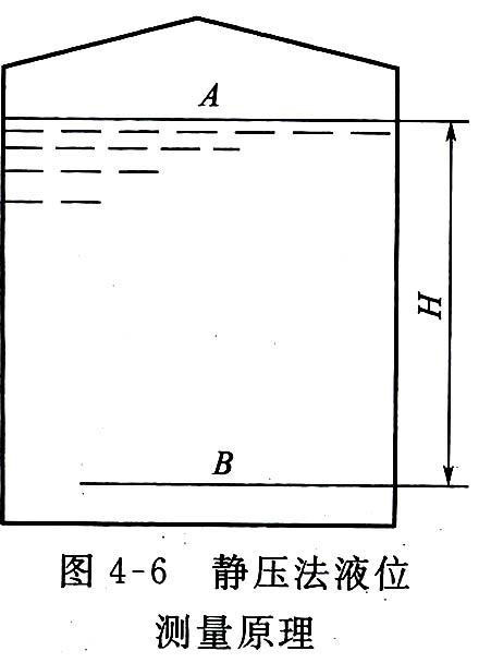 由式(4—8)和式(4—9)可知,液體任何一點(diǎn)的壓力等于其表面壓力加上液體密度與重力加速度及液柱高度的乘積。液體的靜壓力是液位高度和液體密度的函數(shù),當(dāng)液體的密度為常數(shù)時(shí),A、B圖4—6靜壓法液位測(cè)量原理兩點(diǎn)的壓力或壓差僅與液位高度有關(guān)。因此可以通過(guò)測(cè)量P或Ap來(lái)實(shí)現(xiàn)液位高度的測(cè)量。這樣液位高度的測(cè)量就變?yōu)橐后w的靜壓測(cè)量,凡是能夠測(cè)量壓力或壓差的儀表,只要量程合適均可用于液位測(cè)量。