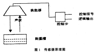 常見的液位傳感器有磁浮筒式、壓力式等,磁浮筒式傳感器要安裝在被測介質(zhì)中,長時(shí)間使用易被腐蝕,而壓力傳感器輸出線性較差且成本較高。超聲波傳感器的特點(diǎn)是使用時(shí)與液面脫離接觸,無腐蝕問題,且價(jià)格低廉。超聲波傳感器由控制卡及換能器構(gòu)成,如圖I。