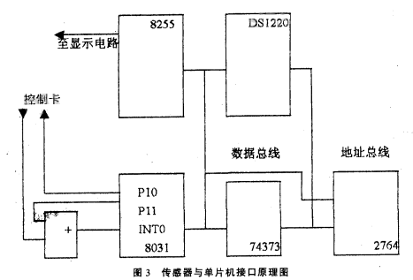 圖3中,單片機(jī)8031、74373和2764組成單片機(jī)核心電路,8255為顯示電路接口,DSl220為不揮發(fā)RAM,用其存儲(chǔ)流量可保證斷電后流量不丟失。工作時(shí)8031每隔一個(gè)采樣周期先啟動(dòng)定時(shí)器T1,然后通過PIO引腳向控制卡發(fā)控制信號(hào),換能器發(fā)一聲波經(jīng)被測污水反射由換能器接收,控制卡的邏輯輸出端輸出一脈沖,脈沖信號(hào)經(jīng)過或門進(jìn)入INTO腳,引起中斷請(qǐng)求。在中斷服務(wù)程序中從定時(shí)器中取出定時(shí)值,計(jì)算出對(duì)應(yīng)的液位。由于傳感器在發(fā)出聲波后,在4MS以內(nèi)會(huì)產(chǎn)生無用的盲區(qū)脈沖,所以在P10向控制卡發(fā)控制脈沖的同時(shí),通過P11引腳發(fā)一個(gè)4ms的高電平封鎖信號(hào),防止“盲區(qū)脈沖”通過或門進(jìn)入INTO引腳。