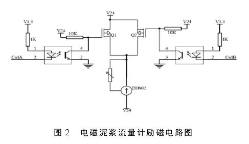 圖中的勵磁電路工作內(nèi)容是控制儀表的工作磁場。其作用原理為 :單片機 MSP430F2418 定時器產(chǎn)生了雙頻矩形波,并經(jīng)光耦隔離后與兩片場效應(yīng)管組成了開關(guān)電路,從而實現(xiàn)了泥漿流量計使用的通斷功能。另一個電路 DH902 是恒流管,其為設(shè)備使用提供恒定的勵磁電流。具體來說,當 MCU 定時器的脈沖寬度調(diào)制(PWM)輸出后,經(jīng)過濾波就能有效控制勵磁電流的幅值,進而產(chǎn)出雙頻矩形波。如圖 2 所示,為電磁泥漿流量計勵磁電路圖。