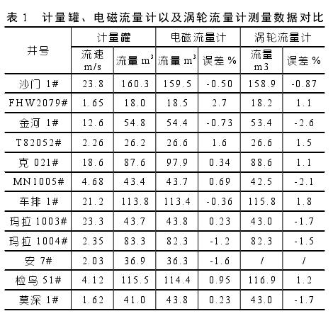 以內(nèi)徑為 DN50 的電磁泥漿流量計應(yīng)用固井測量過程為例,技術(shù)應(yīng)用人員將高壓由壬接入泥漿管線。此過程,測量人員要將其與串接的渦輪流量計進行分析比較,以實現(xiàn)標準計量罐測試的準確性目標。設(shè)備應(yīng)用人員將計量鉆井泥漿的密度范圍控制在 1.15~2.50 g/cm3之間,而對于固井施工現(xiàn)場一次性替漿量,技術(shù)人員應(yīng)將其控制在 18~160 m3之間,替漿瞬時流量則應(yīng)控制在 0.2~2.8 m3/min 之間。如表 1 所示,為某固井采用計量罐、電磁流量計以及渦輪流量計的數(shù)據(jù)對比。