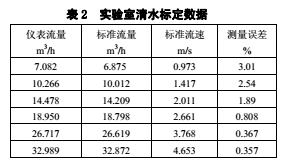 現(xiàn)場試驗所用測量管的內徑為DN50,通過高壓由壬接入泥漿管線,并串接渦輪流量計進行比較,采用標準計量罐測試。計量鉆井泥漿密度范圍為1.15g/cm³~2.50g/cm³,固井設計施工現(xiàn)場一次性替漿量為18m³~160m³,替漿瞬時流量為0.2m³/min~2.8m³/min(流速:1.6~23.8m/s);通過近15口井的施工應用,結果如表1所示。試驗表明儀表計量誤差小于1%;在流速2.0m/s以下,隨著流量的減少測試誤差逐漸提高,在流速1.0m/s左右計量精度降到3%左右。經分析,主要是由零點漂移引起的,這點與實驗室用清水標定結果基本吻合。使用DN50的測量管,實驗室標定結果如表2所示。試驗證明,采用雙頻矩形波作為勵磁信號,可有效地規(guī)避和抑止固井泥漿的流動噪聲和現(xiàn)場震動等所帶來的低頻噪聲,從而顯著提高儀表計量泥漿的精度。