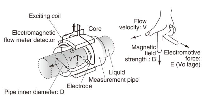 根據(jù)法拉*感應(yīng)定律,在磁場內(nèi)移動導(dǎo)電液體會產(chǎn)生管內(nèi)徑,磁場強(qiáng)度和平均流速都成比例的電動勢(電壓)。換句話說,在磁場中移動的液體的流速被轉(zhuǎn)換成電力。(E正比于V×B×D)
