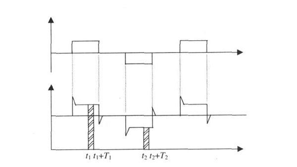 污水處理廢水流量計(jì)一般都采用工頻交流電源供電, 其電源電壓的幅值和頻率的變化都會(huì)給污水處理廢水流量計(jì)帶來(lái)電源性干擾噪聲。對(duì)電源電壓的幅值變化, 因采用多級(jí)集成穩(wěn)壓, 一般而言電源電壓的幅值變化對(duì)電磁流量的測(cè)量精度影響不大。當(dāng)電源電壓的頻率波動(dòng)時(shí), 雖然其波動(dòng)范圍有限, 但對(duì)污水處理廢水流量計(jì)測(cè)量精度影響較大。為了解決工頻干擾問(wèn)題, 實(shí)現(xiàn)對(duì)流體流速感應(yīng)電勢(shì)eab信號(hào)的準(zhǔn)確測(cè)量, 需利用以下基本關(guān)系:①勵(lì)磁周期為工頻周期的整數(shù)倍, 即勵(lì)磁頻率為50/nHz(n為偶數(shù));②正負(fù)勵(lì)磁下的同相位采樣。圖2是對(duì)應(yīng)低頻矩形波勵(lì)磁形式下的典型電勢(shì)信號(hào)形式, 按上述關(guān)系在一個(gè)勵(lì)磁周期下, 若假設(shè)t1 和t2 點(diǎn)為工頻干擾的等效干擾點(diǎn), 且采樣寬度T=T1 =T2 , 則eab的基本算式為: