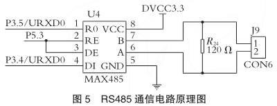 RS485接口組成半雙工網(wǎng)絡(luò),選擇兩線制與上位機(jī)電腦相連,采用屏蔽雙絞線傳輸。通信系統(tǒng)整體為總線式結(jié)構(gòu),這樣1臺(tái)上位機(jī)*多可以和現(xiàn)場32臺(tái)智能儀表相連。采用MAX485芯片完成電壓轉(zhuǎn)換,圖5為RS485通信電路原理圖。
