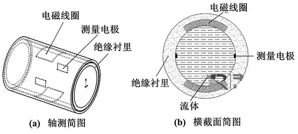 電容式冷卻塔冷卻水流量計從根本上解決了電極表面附著、腐蝕、摩擦等問題,其電極與被測流體間有絕緣襯里隔離,或者直接采用絕緣測量管。電極置于測量管外面或鑲嵌于測量管內(nèi)部。嵌人式冷卻塔冷卻水流量計和外貼式冷卻塔冷卻水流量計的結(jié)構(gòu)如圖2所示。