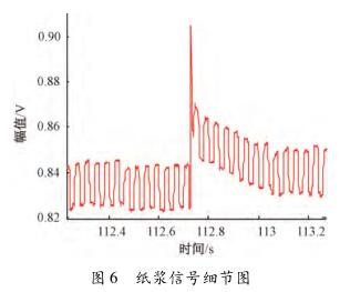 為了進(jìn)一步研究水煤漿信號的特點(diǎn),將其與紙漿信號進(jìn)行對比。通過分析課題組采集的25Hz矩形波勵磁下的紙漿信號發(fā)現(xiàn),在同樣流速下,測量介質(zhì)為紙漿時,傳感器輸出信號經(jīng)調(diào)理放大后能明顯看到與流量相關(guān)的感應(yīng)電動勢信號,且其漿液干擾僅為數(shù)十毫伏,要遠(yuǎn)小于水煤漿信號中的漿液干擾,如圖5所示。對圖5所示的紙漿信號進(jìn)行局部放大,得到如圖6所示的信號??梢?,紙漿信號中的漿液干擾持續(xù)的時間也遠(yuǎn)小于水煤漿信號中的漿液干擾,且頻率較低。