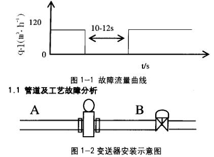 被測(cè)液從A流向B(如圖1-2),傳感器水平安裝,電極水平,傳感器下游2m處裝有調(diào)節(jié)閥,從圖中可以排除由于傳感器中急劇潴留氣和傳感器后無(wú)背壓等情況導(dǎo)致的測(cè)量脈動(dòng)情況產(chǎn)生。