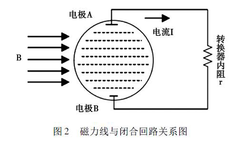 2. 1 正交干擾衛(wèi)生型卡箍電磁流量計(jì)的磁路系統(tǒng)包含有兩個(gè)勵磁線圈,而導(dǎo)管內(nèi)的液體與傳感器電極及轉(zhuǎn)換器結(jié)構(gòu)組成了一個(gè)閉合的回路,如圖2 所示。理論情況下,磁力線( 圖中B) 應(yīng)與閉合回路相平行,但是由于裝配過程中的誤差,導(dǎo)致磁力線不可能完全平行于這一閉合回路,出現(xiàn)部分磁力線成一定角度穿過回路的現(xiàn)象,這引起了即使沒有液體流動的情況下,傳感器的電極上也會產(chǎn)生感應(yīng)電動勢,就形成了正交干擾的基本形式。