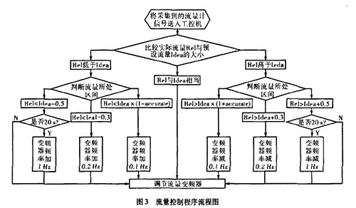 實(shí)際生產(chǎn)中流量一直在某個(gè)區(qū)域內(nèi)波動(dòng),且其動(dòng)態(tài)特性不易掌握。從上面的理論中我們能夠讓誤差△£盡可能的小,這樣距我們所需要的理論值%就越接近。而減小誤差需要我們把n取的盡可能大,也就是在生產(chǎn)時(shí)間內(nèi)劃分更多的周期去調(diào)節(jié)流量。當(dāng)工控機(jī)根據(jù)堿性污水流量計(jì)傳送回來(lái)的信號(hào)發(fā)出調(diào)節(jié)變頻器工作頻率的指令后,電機(jī)調(diào)整功率到堿性污水流量計(jì)的實(shí)際測(cè)量為一個(gè)工作周期,我們知道從指令發(fā)送到實(shí)際測(cè)量值返回有一個(gè)較大的滯后,如果調(diào)節(jié)的周期時(shí)間小于流量計(jì)本身的一個(gè)工作周期,那么顯然不可能達(dá)到減小誤差的目的。利用模糊控制思想H。,在控制程序中我們把流量的波動(dòng)區(qū)域劃分為±缸×Yo,Yo-t-O.3,Yo±0.5四個(gè)區(qū)域,其中缸為可調(diào)節(jié)的誤差范圍,生產(chǎn)中我們?nèi)?.015,流量區(qū)域劃分的單位均為t/h。針對(duì)不同的區(qū)域采取不同的調(diào)整方案。具體流程如圖3所示。圖中變量Rel表示實(shí)際測(cè)量的流量,變量Idea表示理論流量。