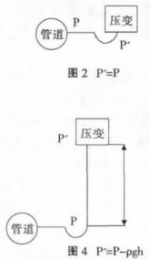 建議采用圖2的安裝方式,如不得已需要選擇圖3、圖4的安裝方式一定要對壓力進行補償。不建議按照圖5的方式安裝,因為無法確定P'與P的關(guān)系。