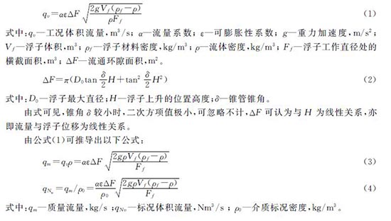 流量計(jì)垂直安裝在管道上,流體自下向上流經(jīng)錐管,浮子在P1、P2差壓作用下產(chǎn)生上升或下移,當(dāng)浮子此差壓(P2-P1)與浮子重力G、浮力F、粘滯力合力平衡時(shí),處于平衡狀態(tài)。建立方程并推導(dǎo)(可參考相關(guān)專業(yè)資料,此處省略),忽略粘滯力影響,假設(shè)流量系數(shù)為常數(shù),可得出浮子位移與流量成線性對(duì)應(yīng)關(guān)系。浮子流量計(jì)的流量方程為: