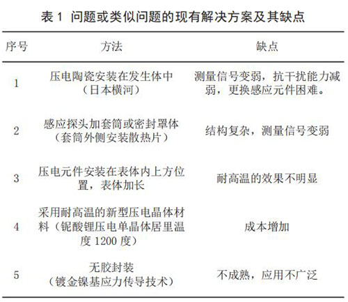 3) 當(dāng)前技術(shù)系統(tǒng)存在的問題。 由于目前使用的傳感器檢測感應(yīng)元件為壓電陶瓷,其極化時居里溫度大約420 ~ 460℃,因此只能在低于 240℃介質(zhì)中使用,一旦被測量介質(zhì)的溫度高于 240℃,二氧化硫流量計傳感器便會因壓電陶瓷達(dá)到居里點,絕緣電阻降低,壓電信號變?nèi)醵А?br /> 4)問題或類似問題的現(xiàn)有解決方案及其缺點(見表 1)。