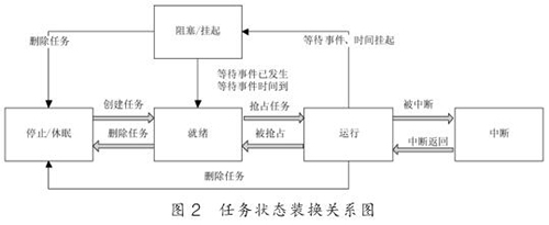 μC/OS-III 中的每一個任務(wù)都是無限循環(huán)的 。 每個任務(wù)會有五種狀態(tài),并且處于五種狀態(tài)之一。 這五種狀態(tài)分別是:睡眠態(tài)、就緒態(tài)、運行態(tài)、等待態(tài)以及中斷服務(wù)態(tài)。 睡眠態(tài)是指任務(wù)只是以代碼的形式存在于程序空間, 并未交給操作系統(tǒng)進行管理; 就緒態(tài)是指系統(tǒng)為任務(wù)配備了任務(wù)控制塊且在任務(wù)就緒表中進行了就緒登記,使任務(wù)具備了運行的充分條件;運行態(tài)是指處于就緒態(tài)的任務(wù)如果經(jīng)調(diào)度器判斷獲得了 CPU 的使用權(quán)時的狀態(tài);等待態(tài)則是正在運行的任務(wù),需要等待一段時間或需要等待一個事件發(fā)生再運行; 中斷服務(wù)狀態(tài)是指一個正在運行的任務(wù)一旦響應(yīng)中斷申請就會中止運行而去執(zhí)行中斷服務(wù)程序。這五種狀態(tài)在系統(tǒng)管理下的轉(zhuǎn)換關(guān)系由圖 2 所示。
