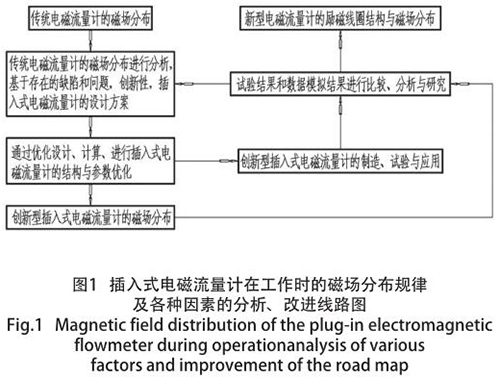 dn80泥漿流量計(jì)因其特殊的結(jié)構(gòu)形式,致使其抗干擾能力較弱、準(zhǔn)確度偏低以及瞬時(shí)流量波動(dòng)過大等不良現(xiàn)象,但便于安裝、造價(jià)低廉、普遍應(yīng)用于大管道等特點(diǎn)而存在。為了發(fā)揮其優(yōu)勢(shì),消除其不利因素,對(duì)其內(nèi)部結(jié)構(gòu)及其相關(guān)技術(shù)參數(shù)進(jìn)行優(yōu)化設(shè)計(jì),從而使其準(zhǔn)確度能夠達(dá)到 ±1% FS,使抗干擾能力得到極大地增強(qiáng)。本文主要通過優(yōu)化設(shè)計(jì)、選擇材料和試驗(yàn),使dn80泥漿流量計(jì)的穩(wěn)定性和準(zhǔn)確度大幅度提高,并提出解決措施,對(duì)實(shí)際應(yīng)用具有參考價(jià)值。分析與研究程序圖如圖 1 所示。