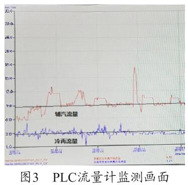 通過圖3可以看出,PLC 上輔汽測量用的沼氣流量計的量程設(shè)置為30t/h,現(xiàn)場設(shè)備量程實際為5t/h,兩者嚴(yán)重不符,因此測量值8.286t/h 為錯誤值,需要對程序進(jìn)行修改。