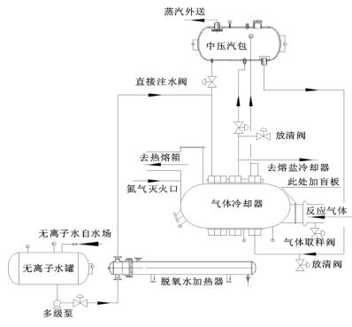 來自無離子水罐的脫氧水經(jīng)多經(jīng)泵加壓、經(jīng)脫氧水加熱器加熱后進入到智能型渦街流量計的水段,脫氧水與反應(yīng)氣體換熱后分兩路:一路進入中壓汽包,保證汽包有穩(wěn)定的液位;一路進入熔鹽冷卻器帶出熔鹽攜帶的反應(yīng)熱。來自中壓汽包的高溫水經(jīng)管路接至智能型渦街流量計汽段底部,高溫水與反應(yīng)氣體換熱后產(chǎn)生高壓蒸汽,高壓蒸汽又返回中壓汽包。汽包還有一路直接注水管路,此路水不經(jīng)過智能型渦街流量計水段,而是直接進入汽包。在智能型渦街流量計出口溫度偏低而汽包液位也比較低時,可開此直接注水管路來穩(wěn)定汽包液位。其詳細(xì)流程圖如圖 2。