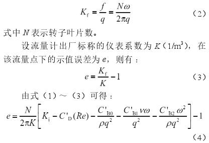 式中q表示體積流量,m3/s;ν表示介質(zhì)的運(yùn)動(dòng)黏度,m2/s;雷諾數(shù)Re=4q/(πdν);d表示流量計(jì)口徑,m;ρ表示介質(zhì)的密度,kg/m3;C'D、C'B0、C'B1和C'B2分別表示4個(gè)待定系數(shù),在某個(gè)流量點(diǎn)下標(biāo)定出的儀表系數(shù)(Kf,表示單位體積流體通過流量計(jì)時(shí),流量計(jì)輸出的脈沖數(shù),1/m3)和轉(zhuǎn)子葉片頻率(f,s-1)的關(guān)系為: