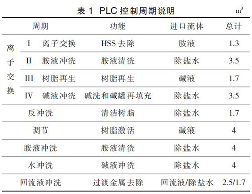 APU 的運(yùn)行按照事先設(shè)定的程序運(yùn)行,即嚴(yán)格遵循設(shè)定的步驟順序。 APU 的正確運(yùn)行依賴(lài)于每個(gè)步驟的順利完成。 按照預(yù)先設(shè)定好的步驟完成 1 個(gè)任務(wù)即視為完成 1 個(gè) APU 運(yùn)行的“周期”。 離子交換的主周期被稱(chēng)為“離子交換周期”。除此之外,整個(gè)控制程序還包含另外 5 個(gè)輔助周期, 分別為反沖洗周期、調(diào)節(jié)周期、胺液沖洗周期、水沖洗周期、回流液沖洗周期。 這 5 個(gè)周期在維護(hù)和非計(jì)劃停車(chē)后重新啟動(dòng)時(shí)使用。 PLC 控制各個(gè)周期的說(shuō)明見(jiàn)表 1。