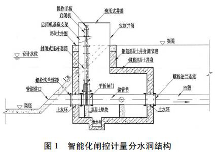 分水洞采用了一種封閉式啟閉閘集成閘井預(yù)制件,包括頂節(jié)、標(biāo)準(zhǔn)節(jié)和底座。與傳統(tǒng)現(xiàn)場澆筑的方式相比,集成閘井采用防水設(shè)計,并且安裝更加方便快捷,很大程度上提高了安裝效率,節(jié)約成本。采用事先預(yù)制好的啟閉閘支座、啟閉機機座,保證了設(shè)備的安裝精度,提高了設(shè)備運行的穩(wěn)定性,減少了設(shè)備的后期維護。分水洞結(jié)構(gòu)除了預(yù)制混凝土外,還可考慮采用玻璃鋼或工程塑料整體制作,用標(biāo)準(zhǔn)節(jié)調(diào)節(jié)高度。分水洞結(jié)構(gòu)設(shè)計見圖 1。