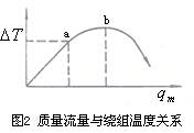 在總的熱傳導(dǎo)系數(shù)a中,因測(cè)量管壁很薄且具有相對(duì)較高熱導(dǎo)率,儀表制成后其值不變,因此a的變化可簡(jiǎn)化認(rèn)為主要是流體邊界層熱導(dǎo)率的變化。當(dāng)使用于某一特定范圍的流體時(shí),則a、cp均視為常量,則質(zhì)量流量?jī)H與繞組平均溫度差成正比,如圖2 oa 段所示。 oa段為儀表正常測(cè)量范圍,儀表出口處流體不帶走熱量,或者說(shuō)帶走熱量極微;超過(guò)a點(diǎn)流量增大到有部分熱量被帶走而呈現(xiàn)非線(xiàn)性,流量超過(guò)b點(diǎn)則大量熱量被帶走。