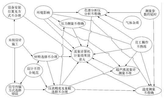 制藥廠污水流量計量系統(tǒng)計量的準(zhǔn)確性既與制藥廠污水流量計本體有關(guān),也和壓力、溫度測量儀表、色譜分析儀以及流量計算機(jī)等設(shè)備的可靠性有直接關(guān)系。此外,在員工操作、環(huán)境影響、設(shè)計選型、設(shè)備安裝等方面也會一定程度影響制藥廠污水流量計量的準(zhǔn)確性,其影響因素復(fù)雜多樣。電磁計量系統(tǒng)計量準(zhǔn)確性影響因素關(guān)聯(lián)關(guān)系如圖2所示。在實際生產(chǎn)應(yīng)用中,對制藥廠污水流量計量準(zhǔn)確性造成較大影響的主要是噪音、液體計量雜質(zhì)、氣體組分分析以及壓力、溫度測量這四個方面。