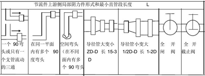 節(jié)流裝置的安裝和適用于下列管段和管件有關(guān):節(jié)流件上游側(cè)*一阻力件、*二阻力件,節(jié)流件下右側(cè)*一阻力件,從節(jié)流件上游*二阻力件到下游*一阻力件之間的管段以及差壓訊號(hào)管路等。