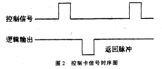 其外部特性如圖2所示。其工作原理是,每當(dāng)在“控制信號(hào)”端加一正脈沖(寬度0.2ms),控制卡便通過換能器發(fā)一束超聲波,當(dāng)超聲波遇被測污水反射后又被換能器接收,控制卡便通過“邏輯輸出”端輸出一“返回脈沖”。通過計(jì)量“控制信號(hào)”到“返回脈沖”之間的時(shí)間T便可按下式計(jì)算出換能器距被測污水表面的距離H,由于安裝時(shí)換能器固定在污水的上方(高度不變),因此,換能器距污水底部的距離HO(其值已知)減去H即為污水液位H1。